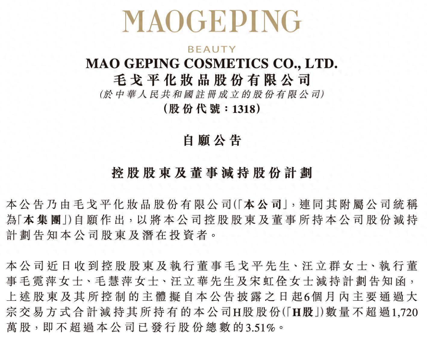 1月6日,知名国货美妆品牌毛戈平(01318)发布公告,公司近日收到控股股东及执行董事毛戈平、汪立群、执行董事毛霓萍、毛慧萍、汪立华及宋虹佺减持计划告知函。