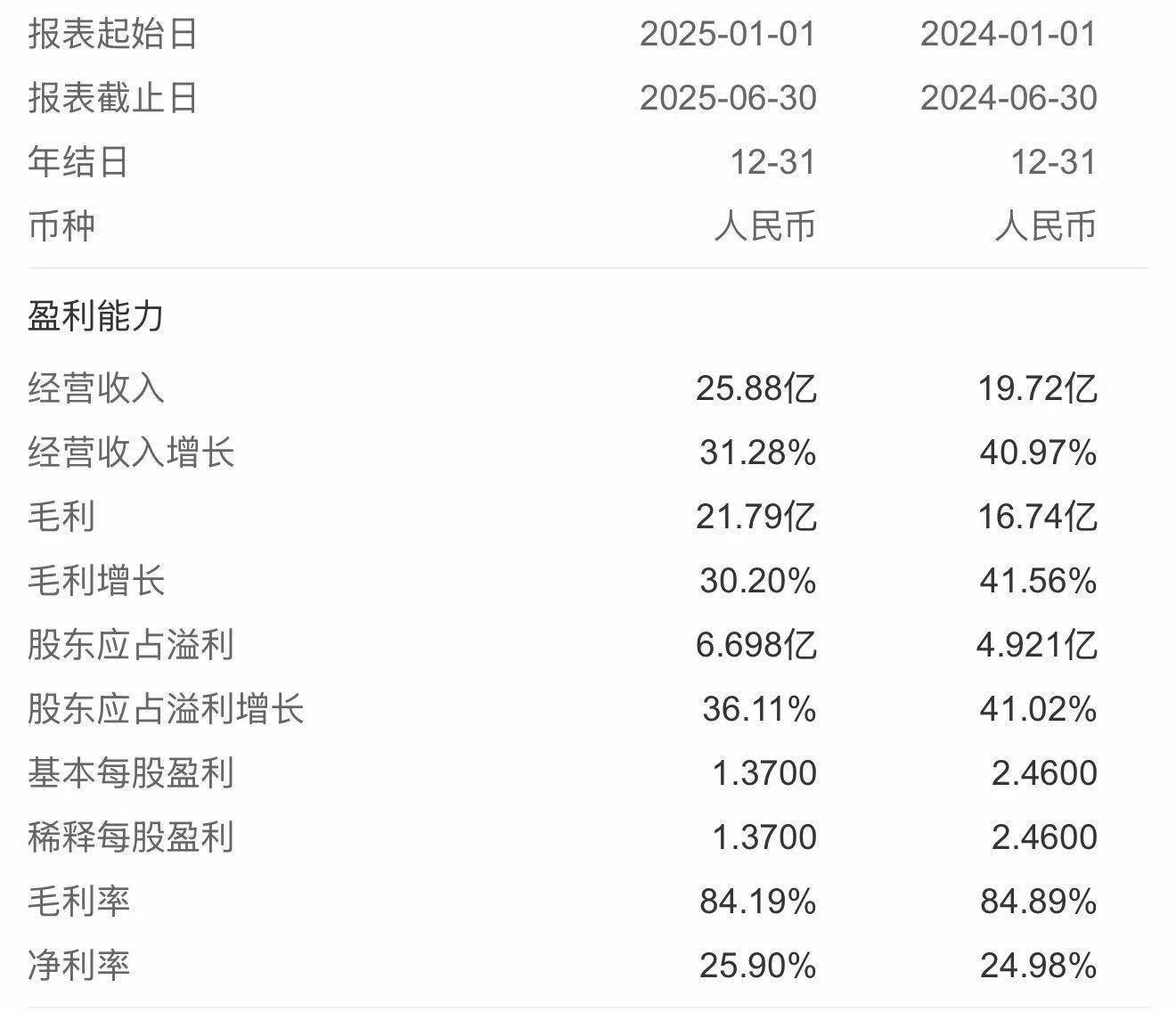 2025年上半年,公司实现营业收入25.88亿元,同比增长31.28%;归母净利润6.7亿元,同比增长36.11%;经营活动产生的现金流量净额为8.31亿元,同比增长34.17%;毛利率为84.2%,较上一年同期的84.9%略微下降,但在行业内依然是高毛利的水平。