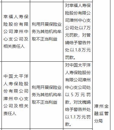 罚单显示,幸福人寿保险股份有限公司漳州中心支公司因利用开展保险业务为其他机构牟取不正当利益,被处以7万元罚款。曾婧作为相关责任人,被给予警告并处以1.8万元罚款。